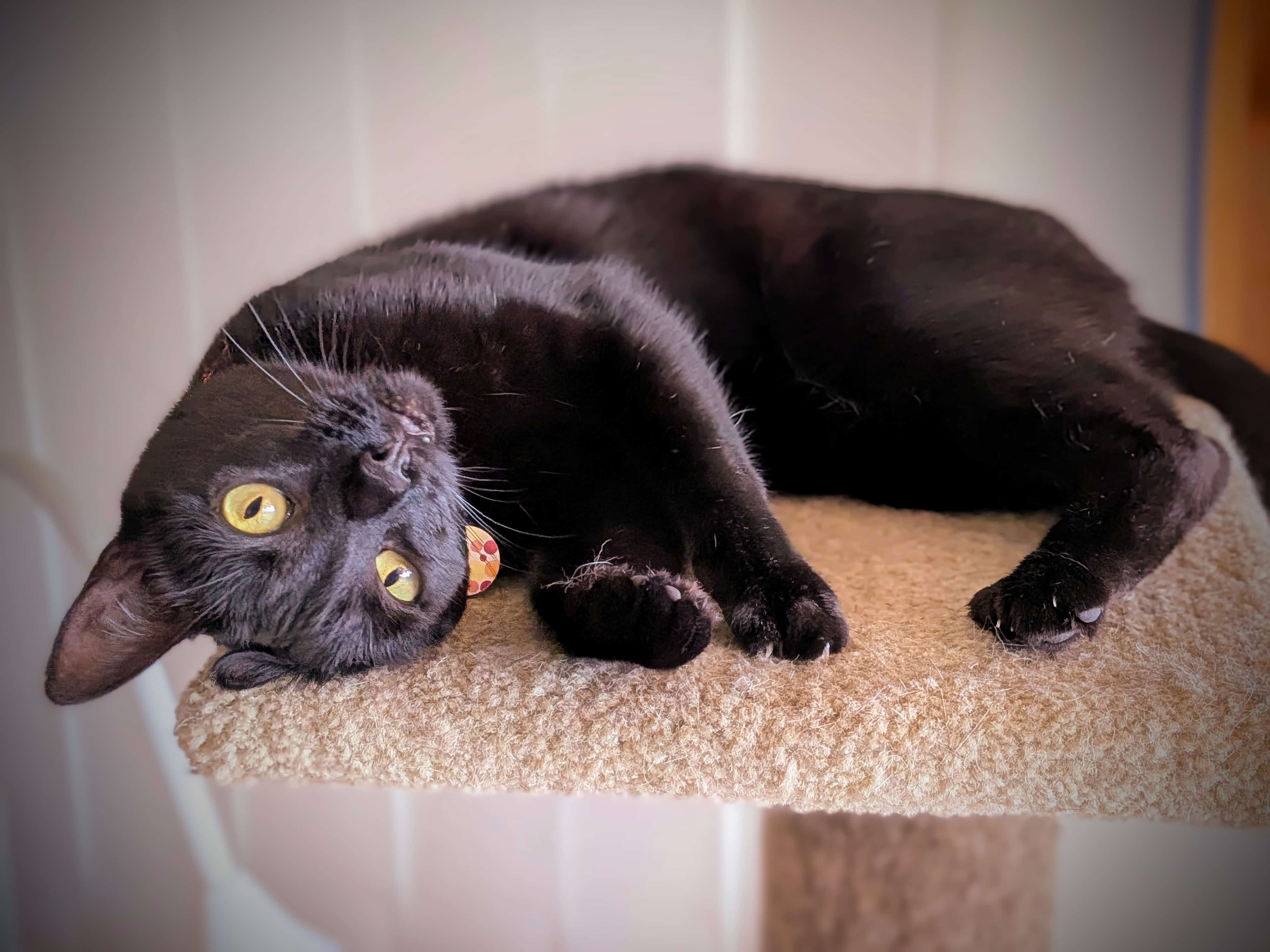 Velvet's name suits her well, as her shiny black coat is a wonder to pat. She loves her wet food which is what she uses to keep her coat sleek. As the diva she dresses up to be, Velvet would prefer a quiet home of her own with people she can snuggle with and watch some TV, which is the only place other animals should be. A cream treat is an indulgence to be used to capture her heart. While she likes to have a hidey hole to curl up in by herself now and again, she will still spend time with her people, offering head boops and affection.