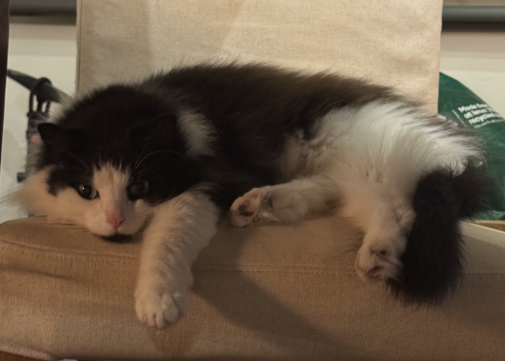 I’m a 6-year-old white and black Domestic Medium Hair girl with a very soft heart. I can be quite shy when I first arrive somewhere new, but please don’t let that worry you—I just need a little time and patience to feel safe.