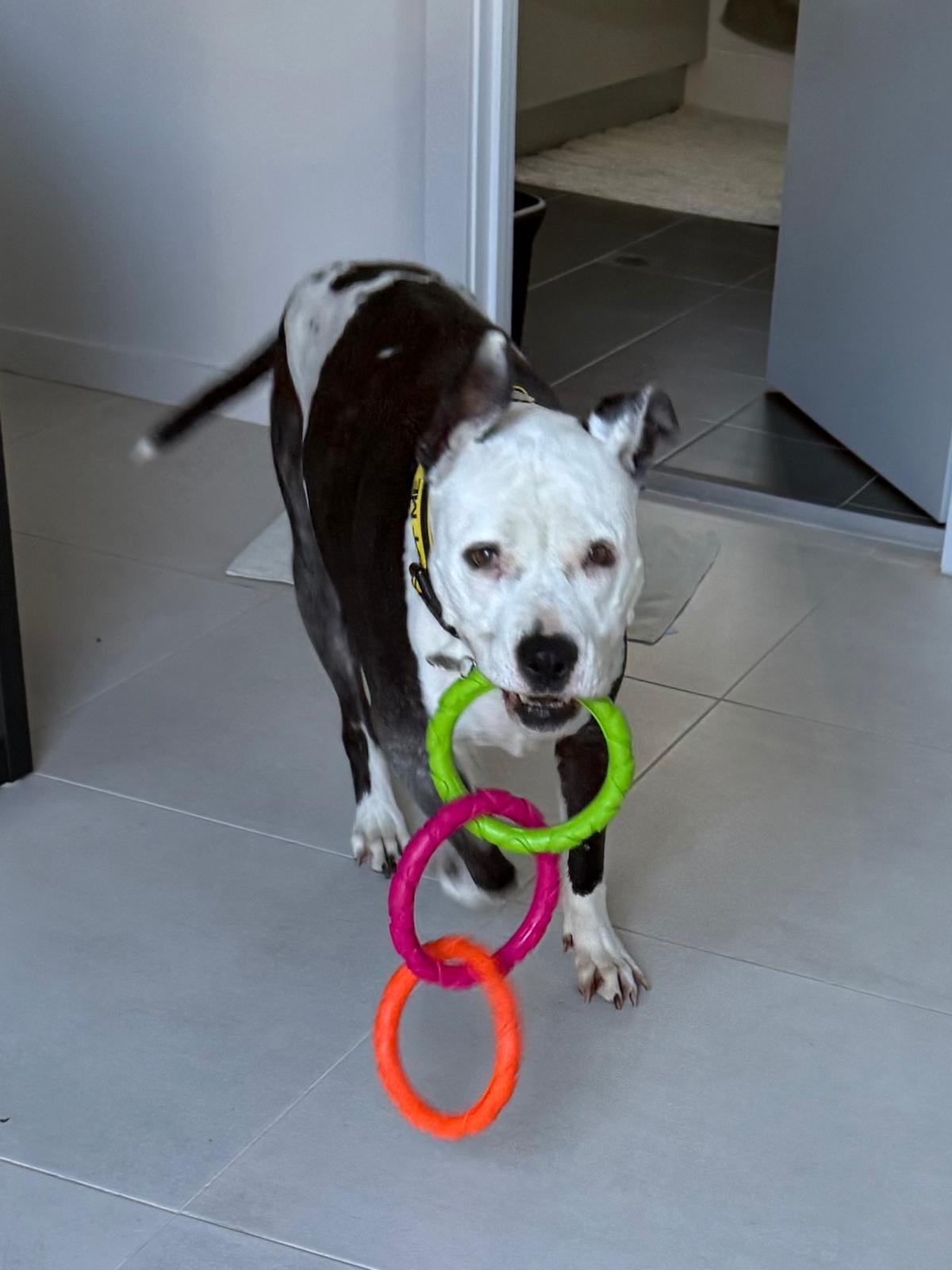 Hi, I'm Sky! I’m a senior Staffy X looking for a loving home where I can enjoy my golden years. I may be a little older, but that just means I’m full of wisdom and ready to give all my love to someone special. I’m a total sweetheart who loves being around people, whether we're lounging together on the couch or playing with my favourite toys. I really enjoy a good play session, and I can’t resist chasing after toys and giving them a good chew!