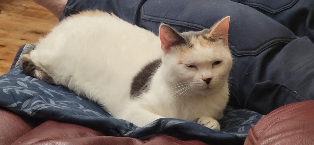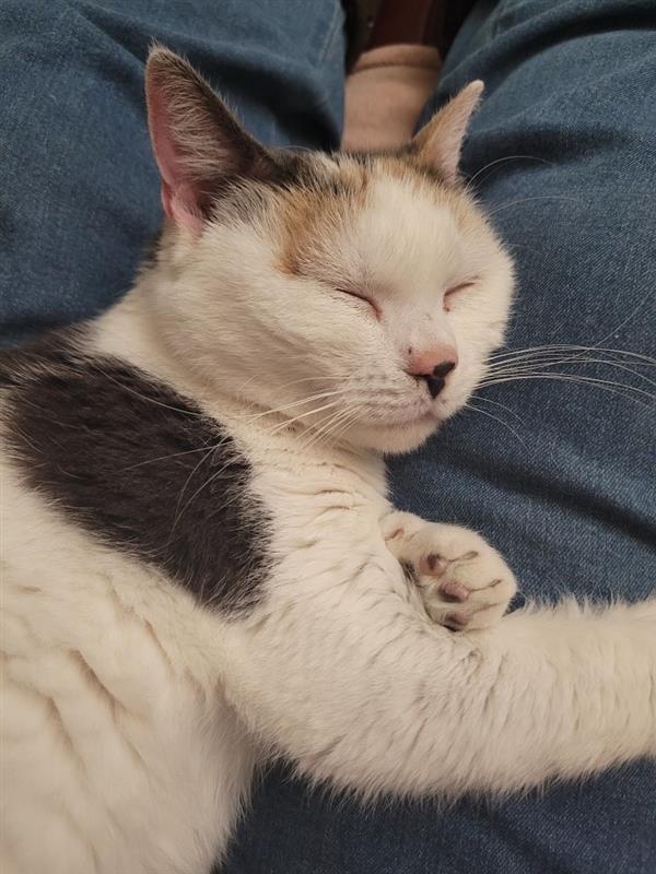 Though she’s mostly a napper, Sashi does have her playful moments—especially when the string toy comes out. She’s also very food motivated and has a particular fondness for chicken, which is a great way to win her heart. Once she bonds with you, she will be a loving and gentle companion who simply wants to share quiet moments and feel safe by your side.