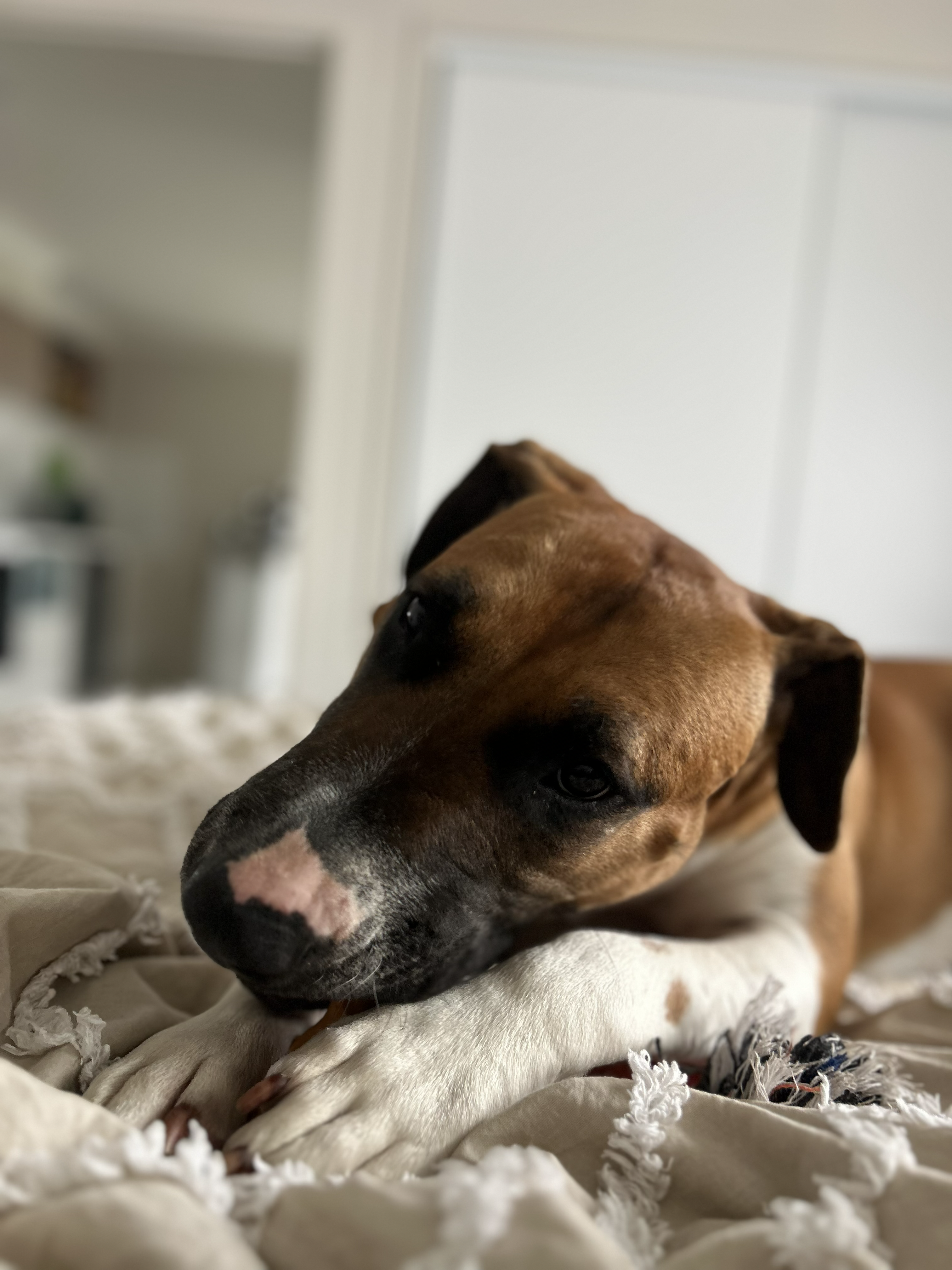 I'm a medium energy dog, I like to get out and about but love a nice nap in the sun too! I'm not a huge fan of other animals, mostly because I'm just too rude and excited with them! I'll need some work with a positive trainer to learn how to be properly social with other dogs or polite to cats. Because of my boisterous nature I'm better suited to children over 12 who are confident with large dogs.