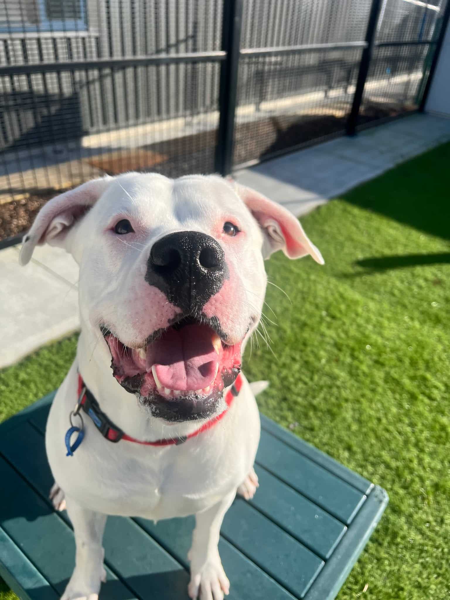 Oh hey there! I’m Ross—a super sweet, ridiculously cute white Staffy with a big ol’ head made for smooches and a heart full of love (and maybe a few cheeky antics). I’m currently on the hunt for my forever humans—you know, the kind who love a little goofball energy mixed with couch potato vibes.