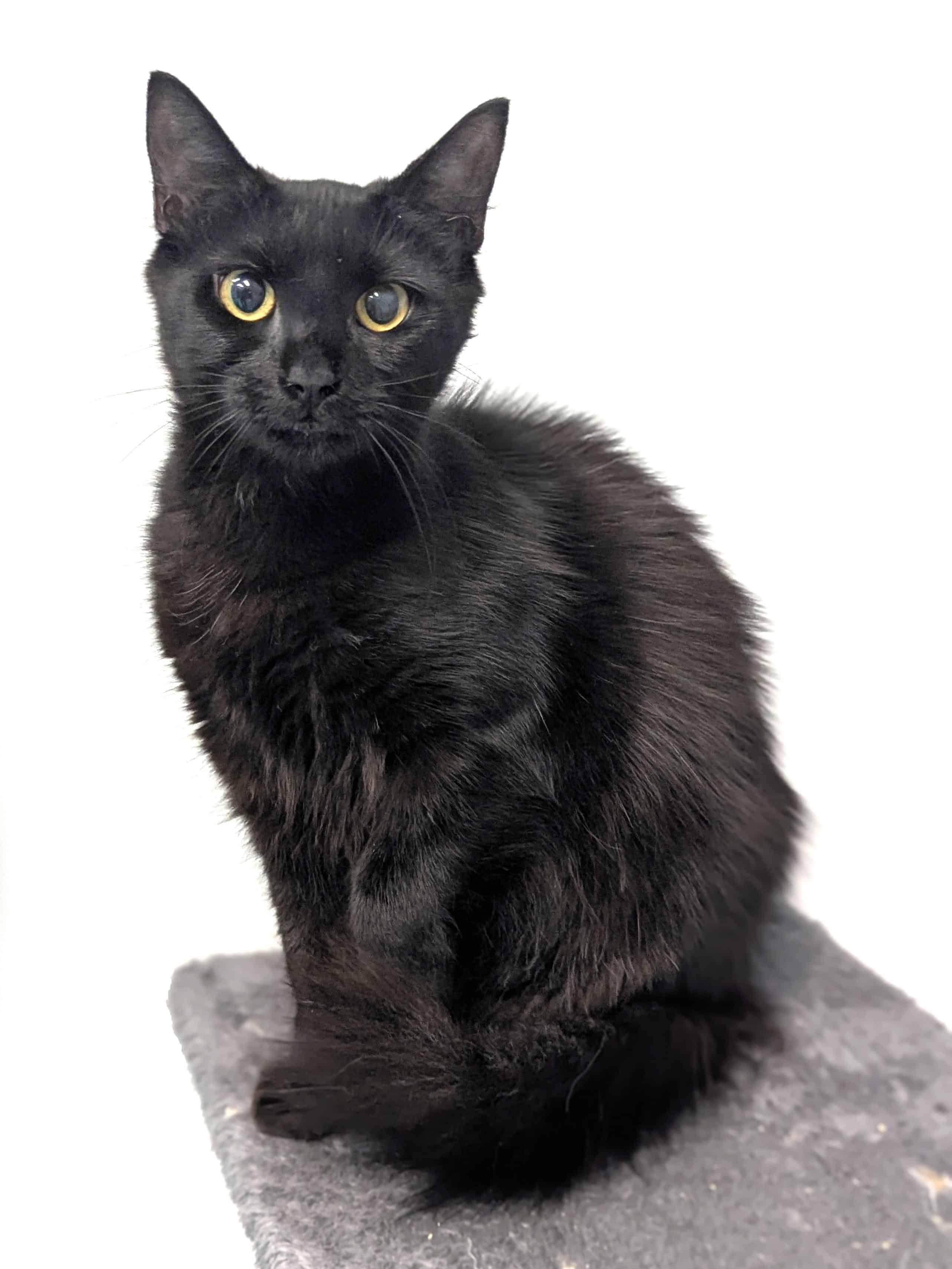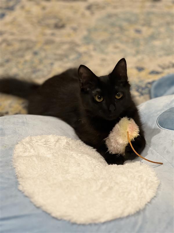 Wednesday is a beautiful black kitten with a sleek coat and bright, curious eyes that seem to take in everything around her. She’s a gentle and thoughtful little soul who prefers quiet moments and calm environments over too much hustle and bustle. Once she feels safe, she shows her sweet and affectionate side, curling up close for naps or softly purring while being petted.