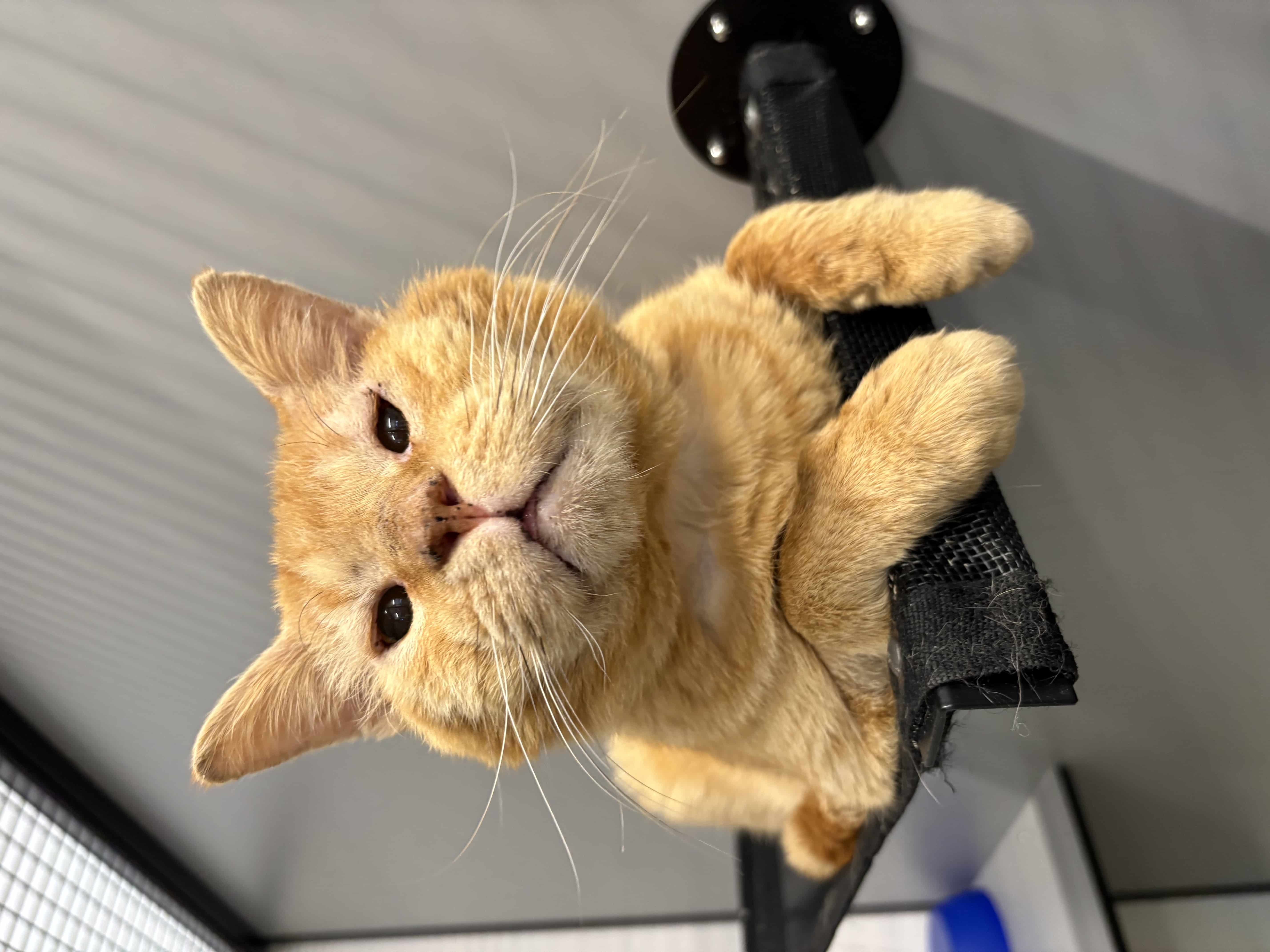 You might notice I look a little unique due to an old injury to my face, but don’t worry—I’m still your everyday normal cat with plenty of love to give. One of my favourite things to do is perch on top of my scratcher and watch the world go by. It’s my peaceful little routine.