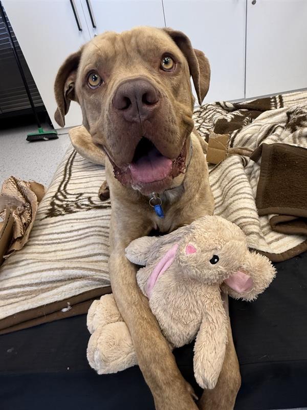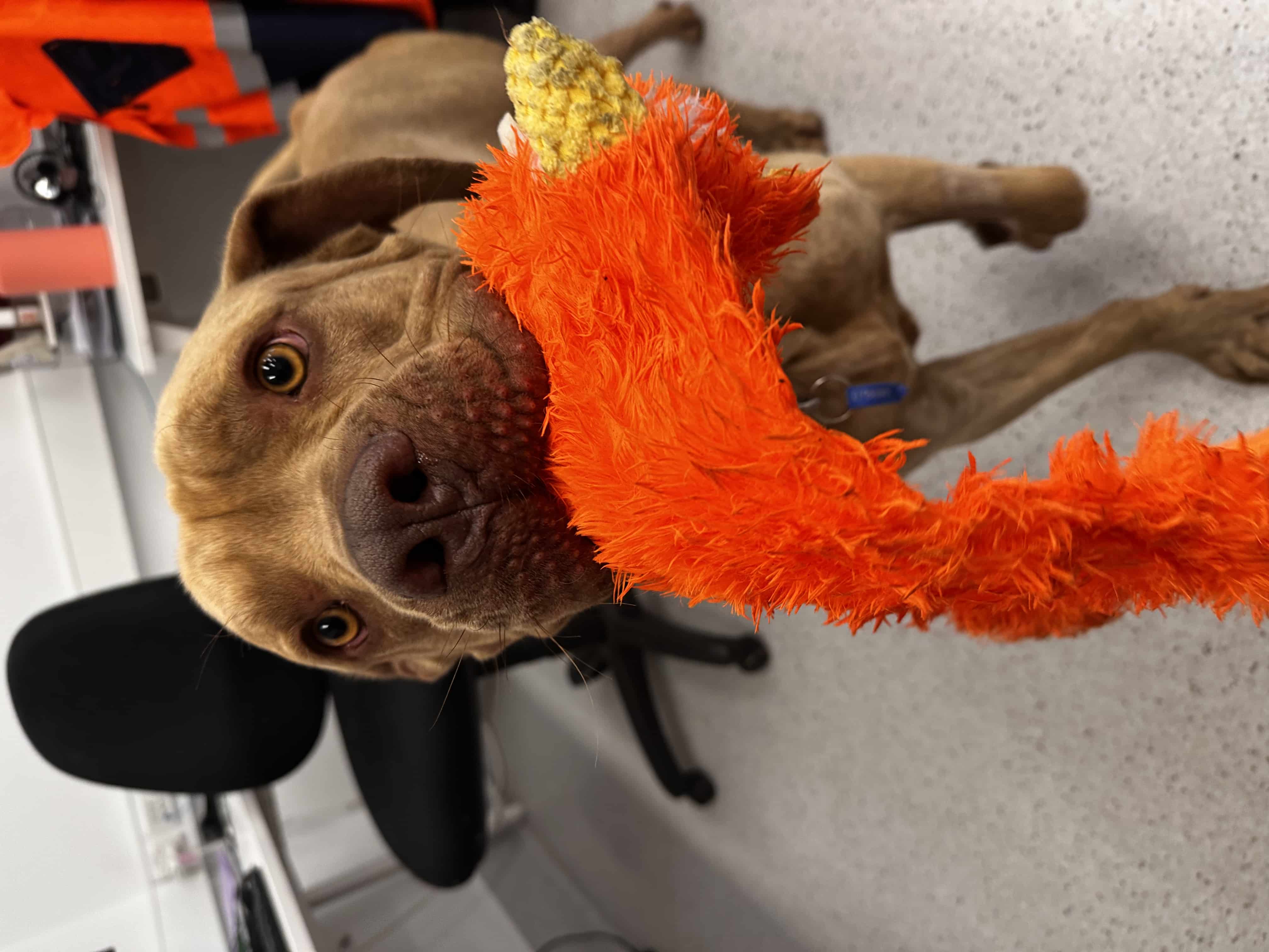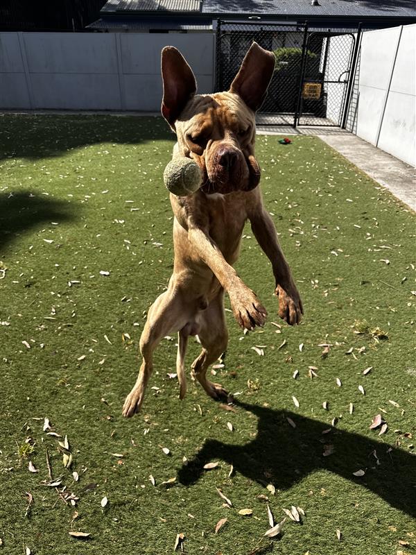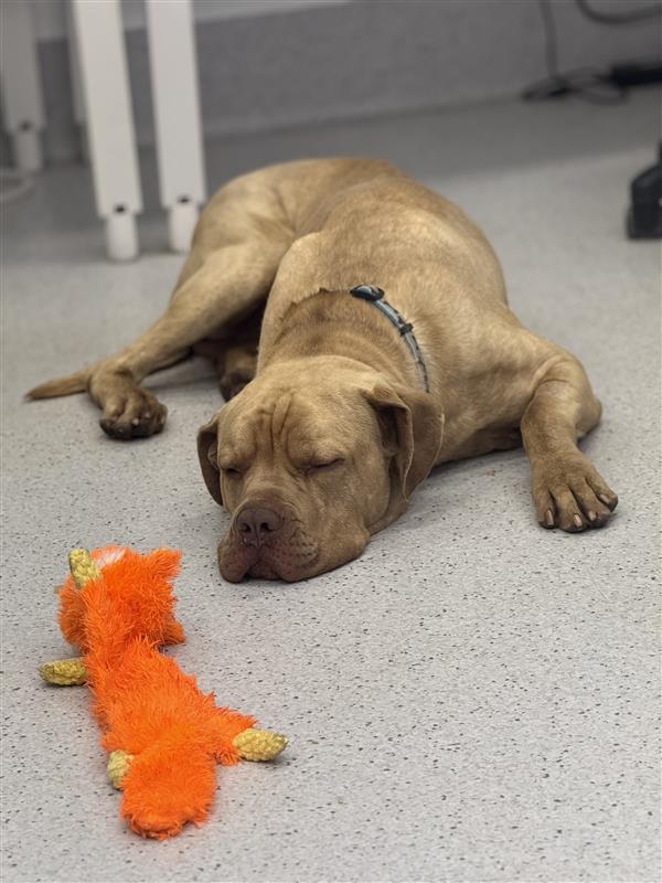 I’m a big, gentle Neapolitan Mastiff with an even bigger heart. My favourite things in the world are my stuffed toys—especially the ones that squeak! I love carrying them around and giving them a good chew. Hard chews are another favourite—they keep me entertained and happy.
