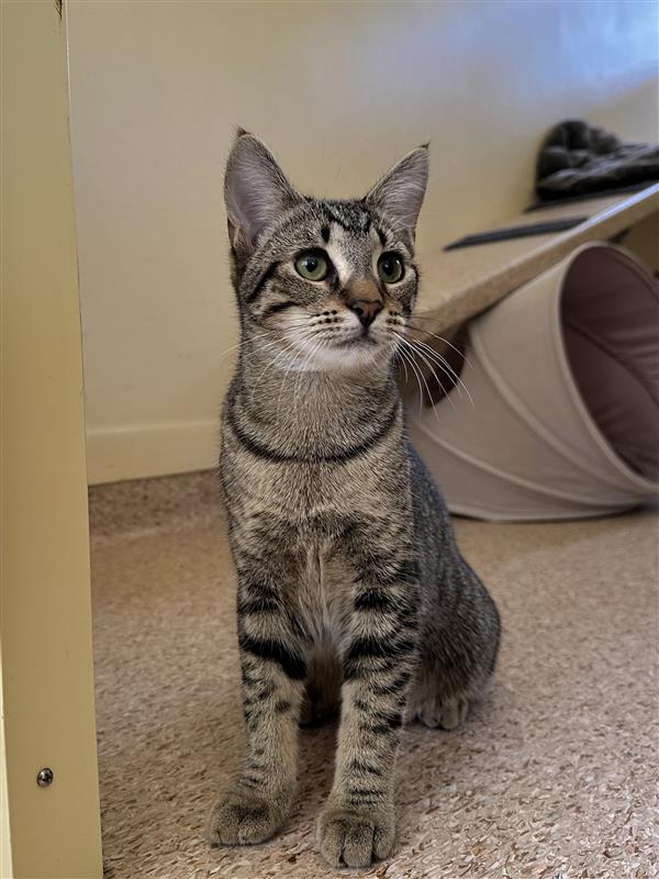 I’m still learning that people can be trusted, so I’m looking for a patient, Quiet/calm home that lets me move at my own pace. We are not used to touch or handling just yet, what I really need is a peaceful space where I can feel secure. Once I’m comfortable, I love chasing toys, pouncing on anything that moves, and exploring every corner like the curious kitten I am. I may not be a lap cat just yet, but my playful spirit and gentle presence make me a wonderful companion.