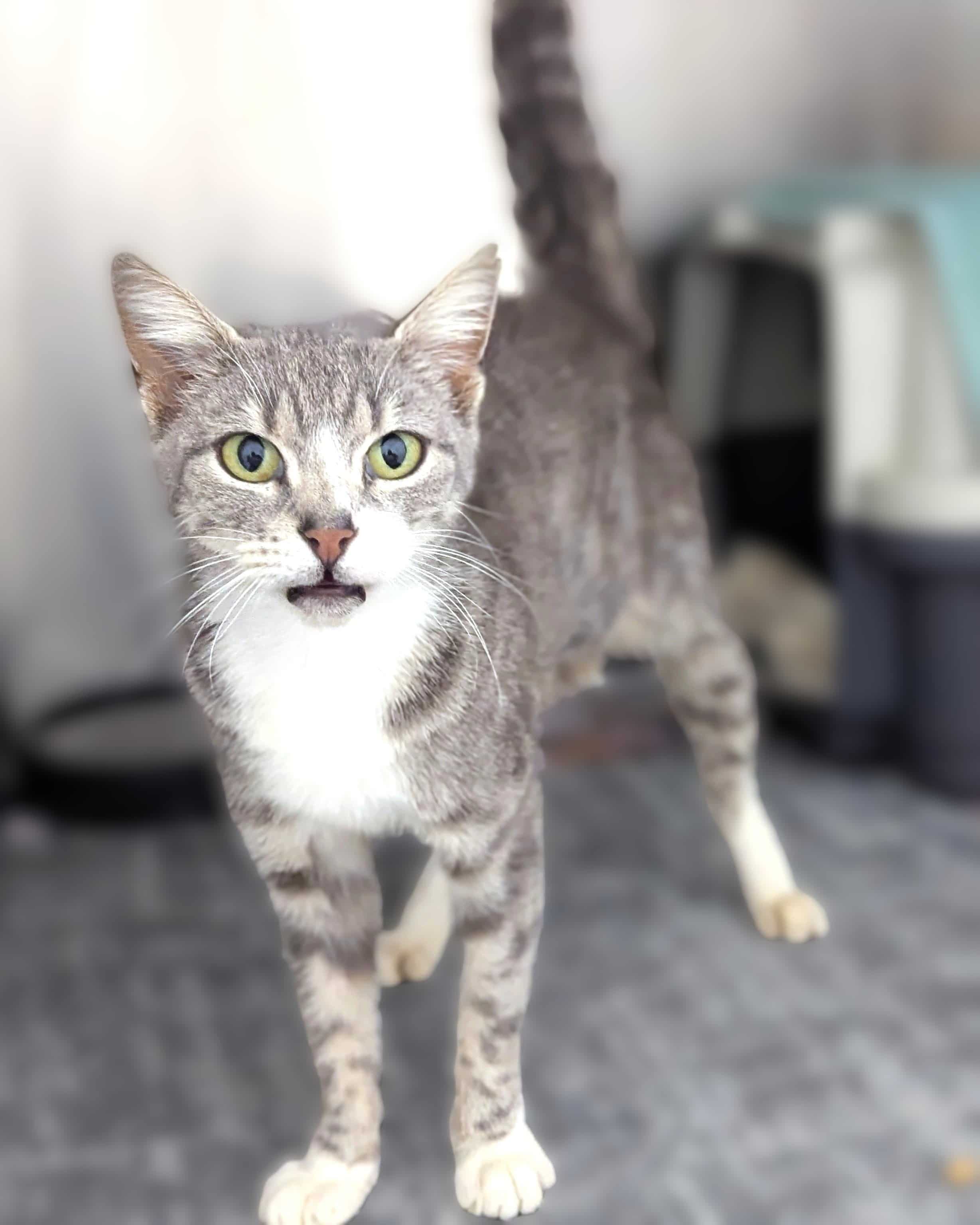 I’m a grey tabby with white patches, soft fur, and a very big heart—though I don’t show it right away. I’m an affectionate cat, but I need a little time to feel safe with new people. I hope that’s okay.