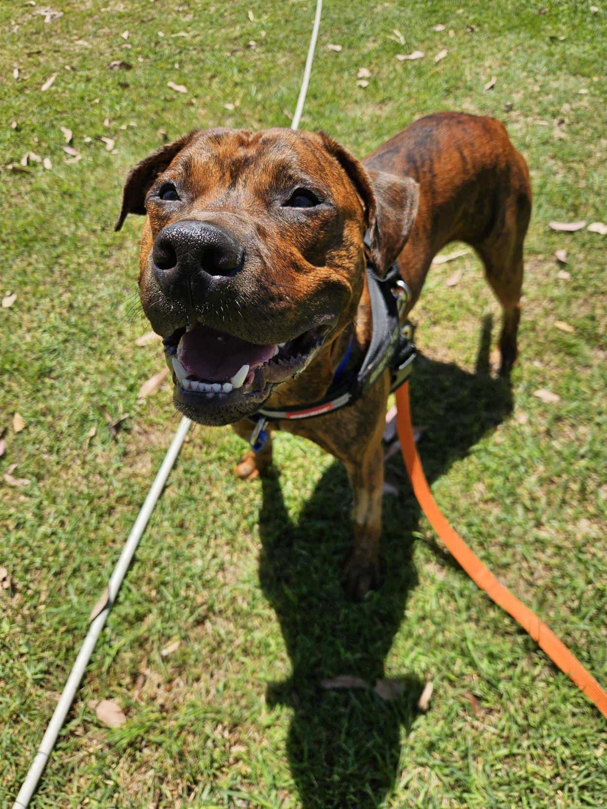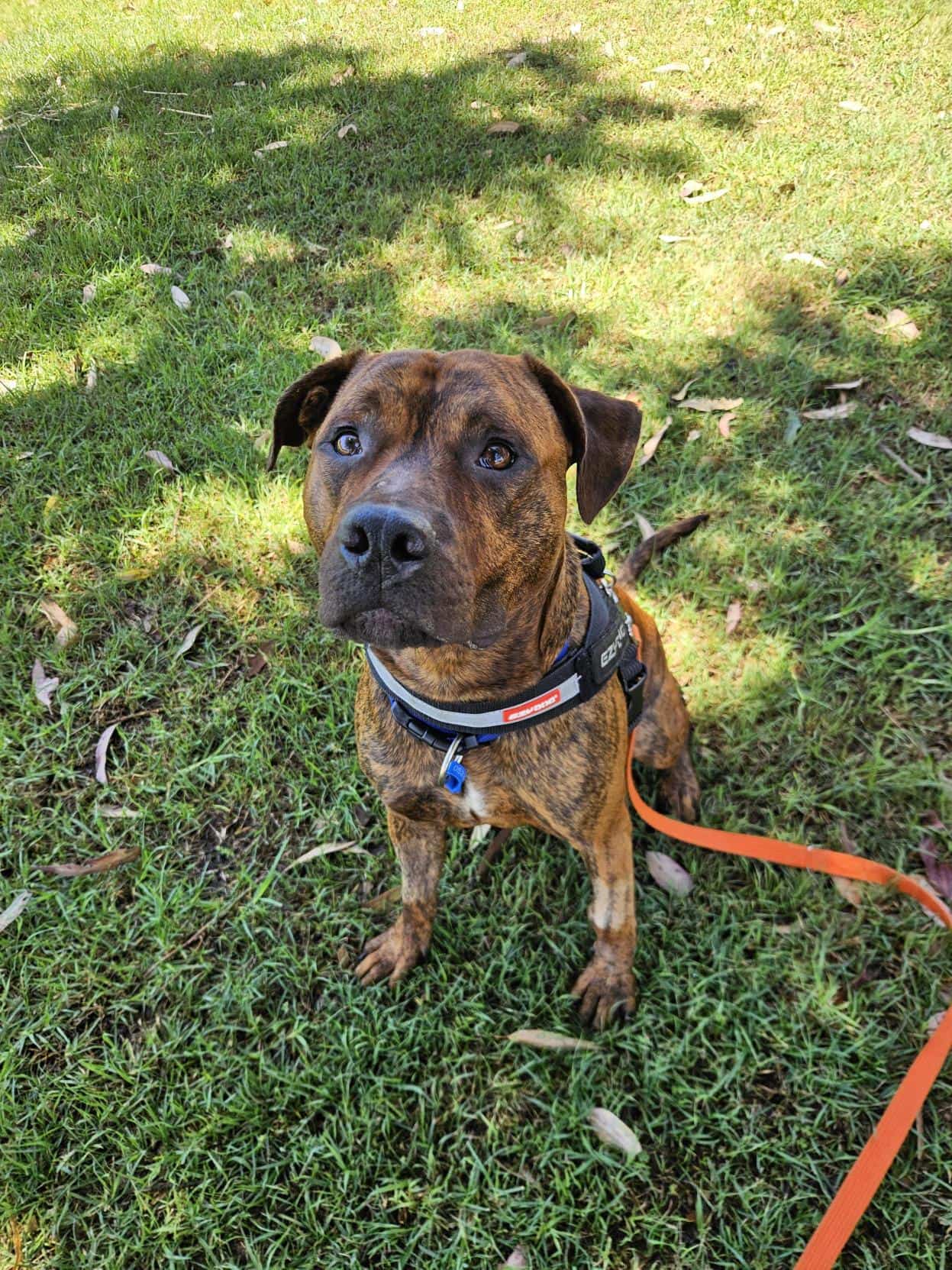 Yes, the Ackillies — 1-year-old American Staffordshire Terrier, brindle-coated heartthrob, future couch king, current tug-of-war world champion, and professional good boy in training.