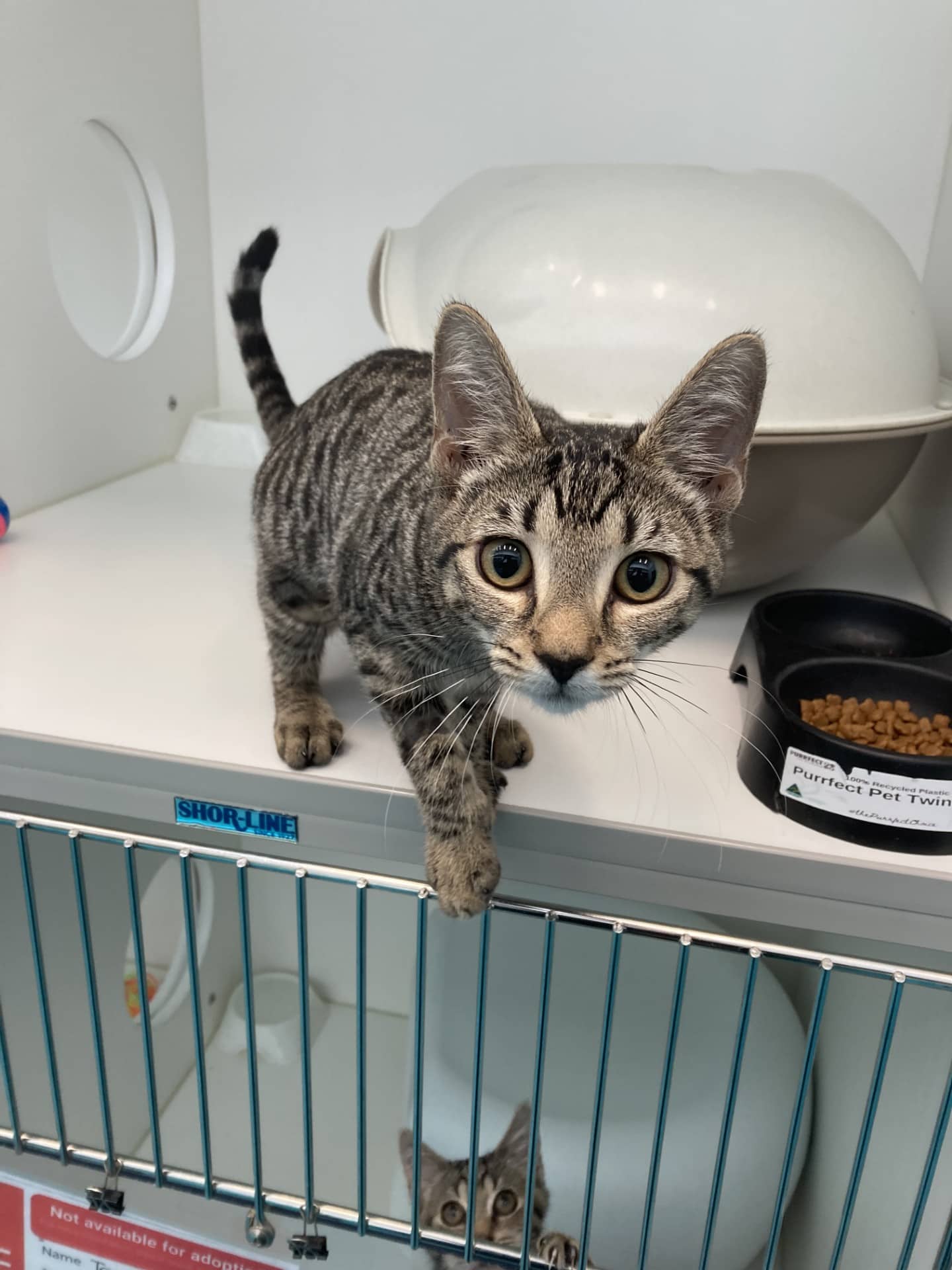 Hi, I’m Sharknado, a female Domestic Short Hair kitten. I’m 4 months old. I’m curious, cuddly, and happy to play, then nap in a sunbeam. My energy is average: I love a good chase with feather toys and a gentle lap soon after. I’m learning the routine of a family, and I’m great at curling up for quiet time when the day slows down. I’m litter trained and I’ll happily follow you from room to room, exploring new smells and spots. Right now I’m working on my confidence, and I’ll thrive in a warm home with patient people who can show me the ropes. Best with Children Aged: No known child related issues. I’m looking for a forever home with love, daily play, and a safe environment where I can grow into a confident young cat. A light routine of feeding, brushing, and regular vet checkups will help me shine. If you’re ready for a playful, affectionate companion who’s ready to become part of your family, I’m Sharknado and I can’t wait to meet you.