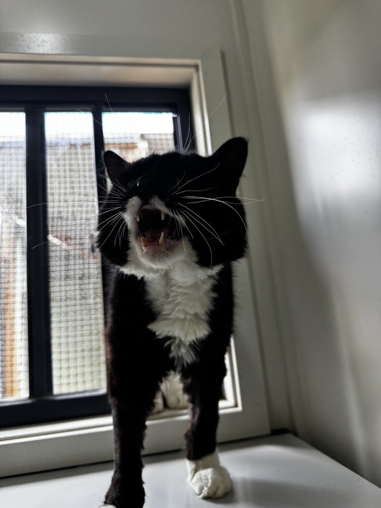 Arthur is a charming black-and-white gentleman with a delightfully unique look—his half tail just adds to his character and makes him extra memorable. This handsome boy is a certified window-perching professional and can often be found soaking up the view, supervising the neighborhood, or catching sunbeams like it’s his full-time job.