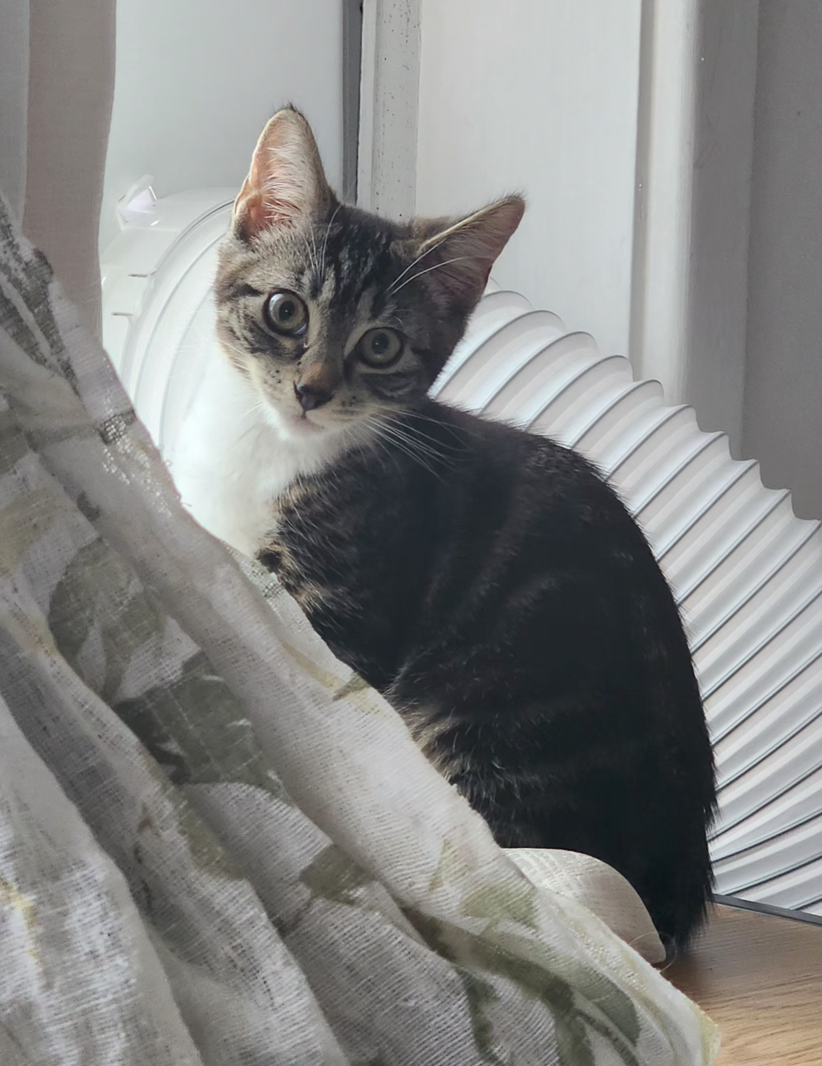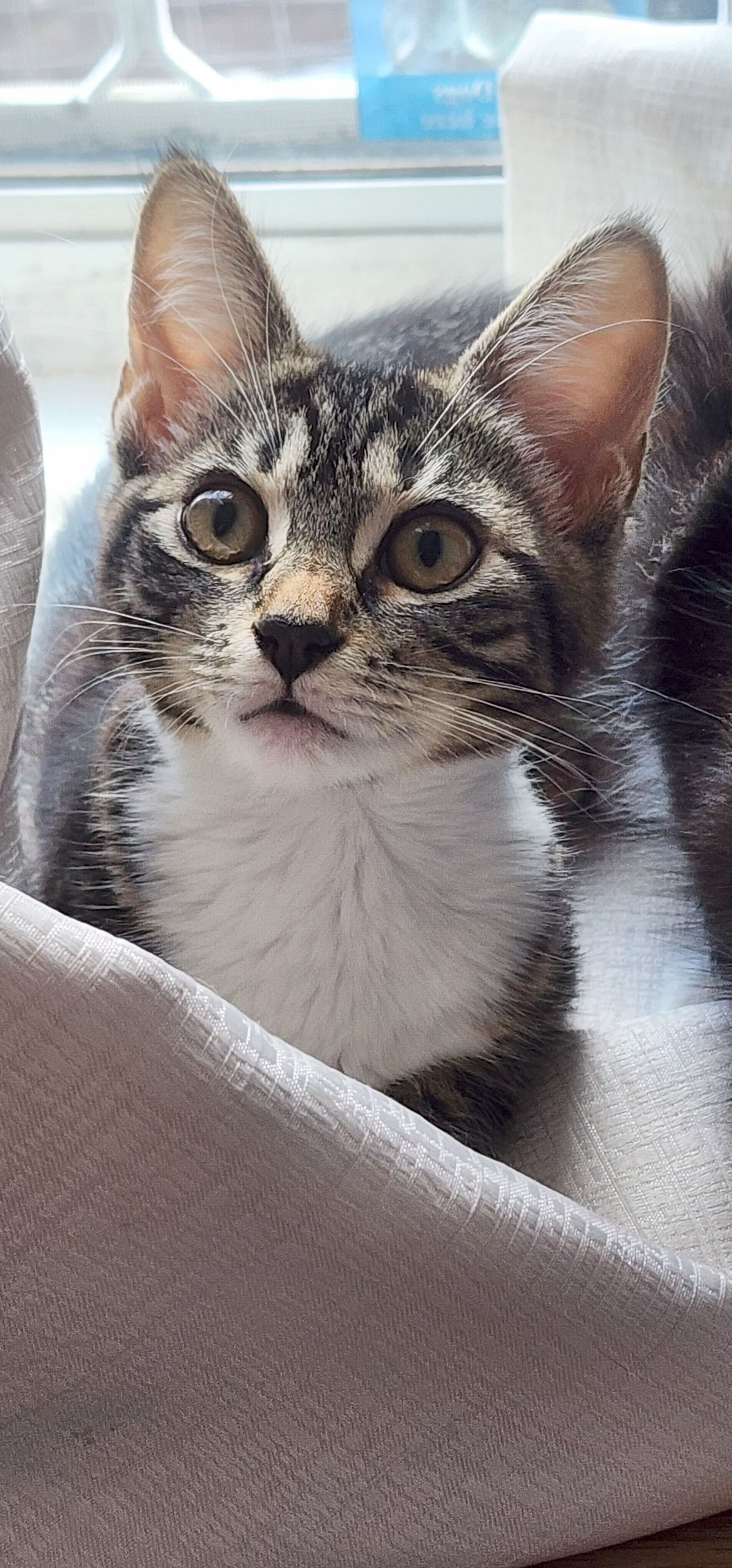 Meet Minnie, a gorgeous domestic shorthair tabby-and-white kitten with a gentle soul and a thoughtful little gaze. Minnie is the kind of kitten who likes to take the world in at her own pace—observing first, then joining in once she feels safe and comfortable. Her sweet nature really shines when she’s in a calm, predictable environment where she can relax and be herself.