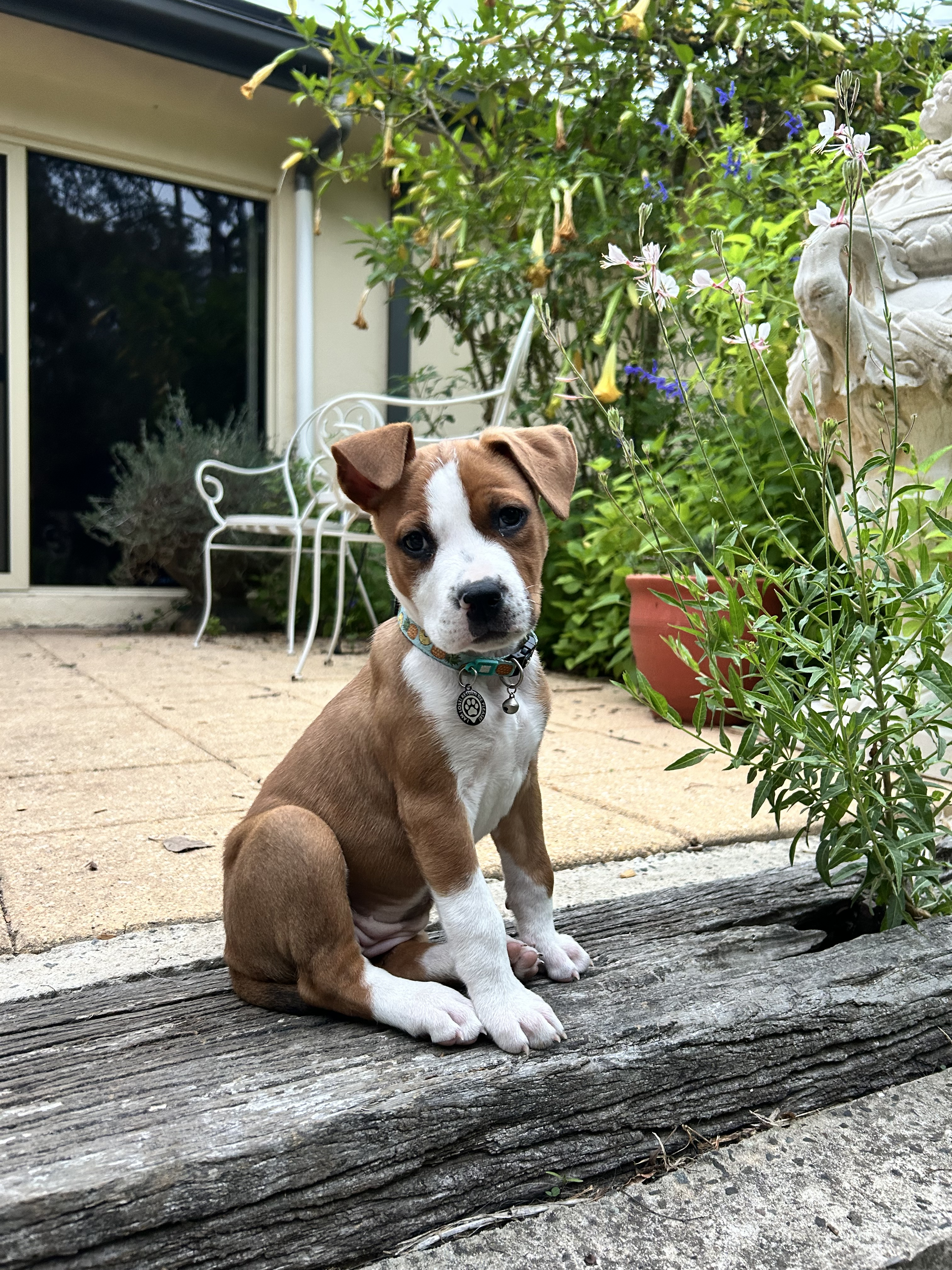 Hi, I’m Poppy, a female Staffordshire Terrier cross Jack Russell puppy. I’m 2 months old. I’d do best with someone who works average hours, because I love play but also enjoy cuddles and nap time. My energy is moderate—I’ll sprint for a few minutes, then settle in for a snuggle. I need daily opportunities to learn about life—new people, little training sessions, and social time with other dogs. I appear dog-social and have no known issues with other pets. I have no known child-related issues, so I should be good with kids with gentle, supervised introductions as I grow as I will be a medium breed dog. If you’re looking for a bright, affectionate companion who will grow with you, I could be the one. Adopt me and you’ll get a curious, confident buddy who loves to learn, play, and be by your side.