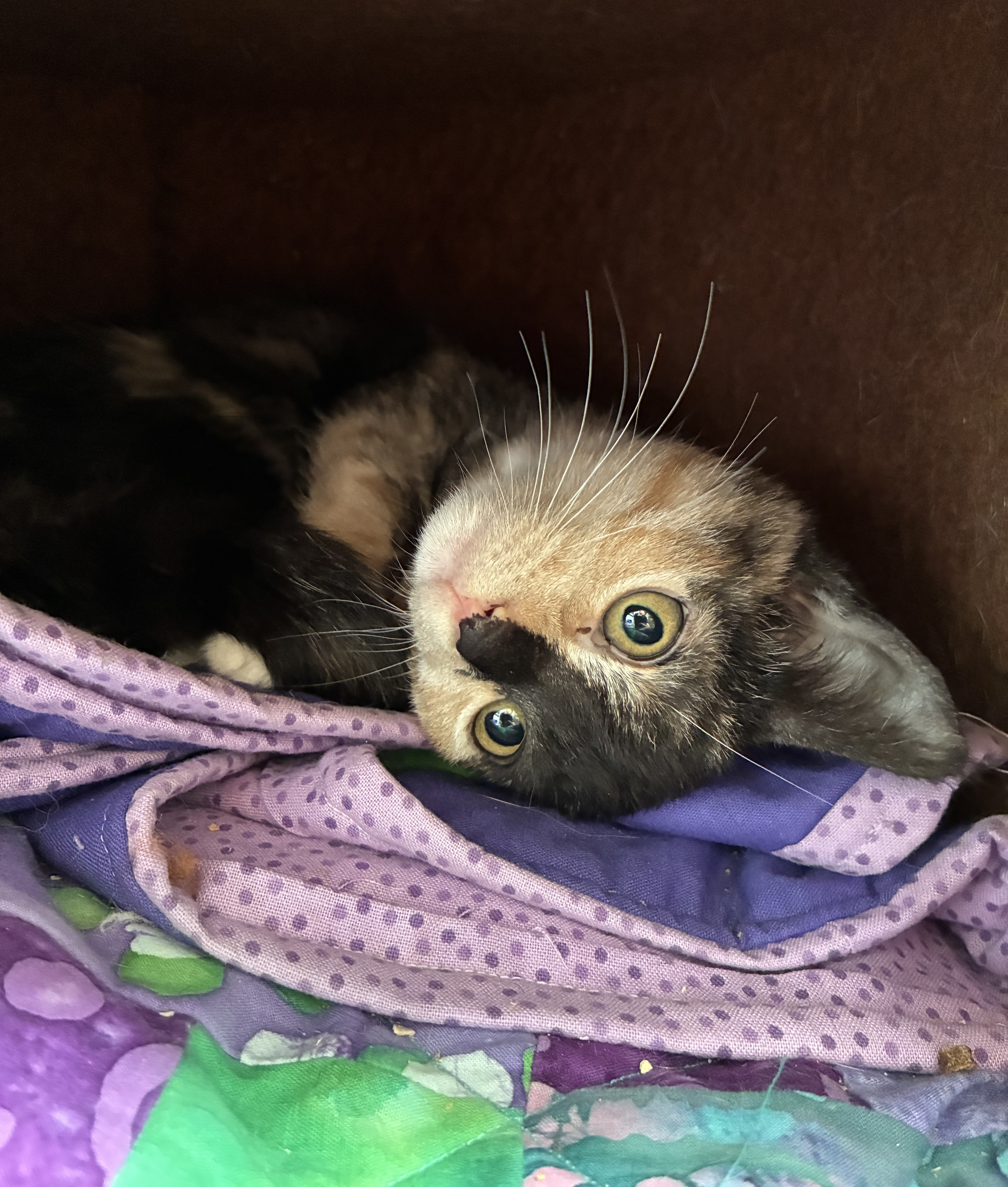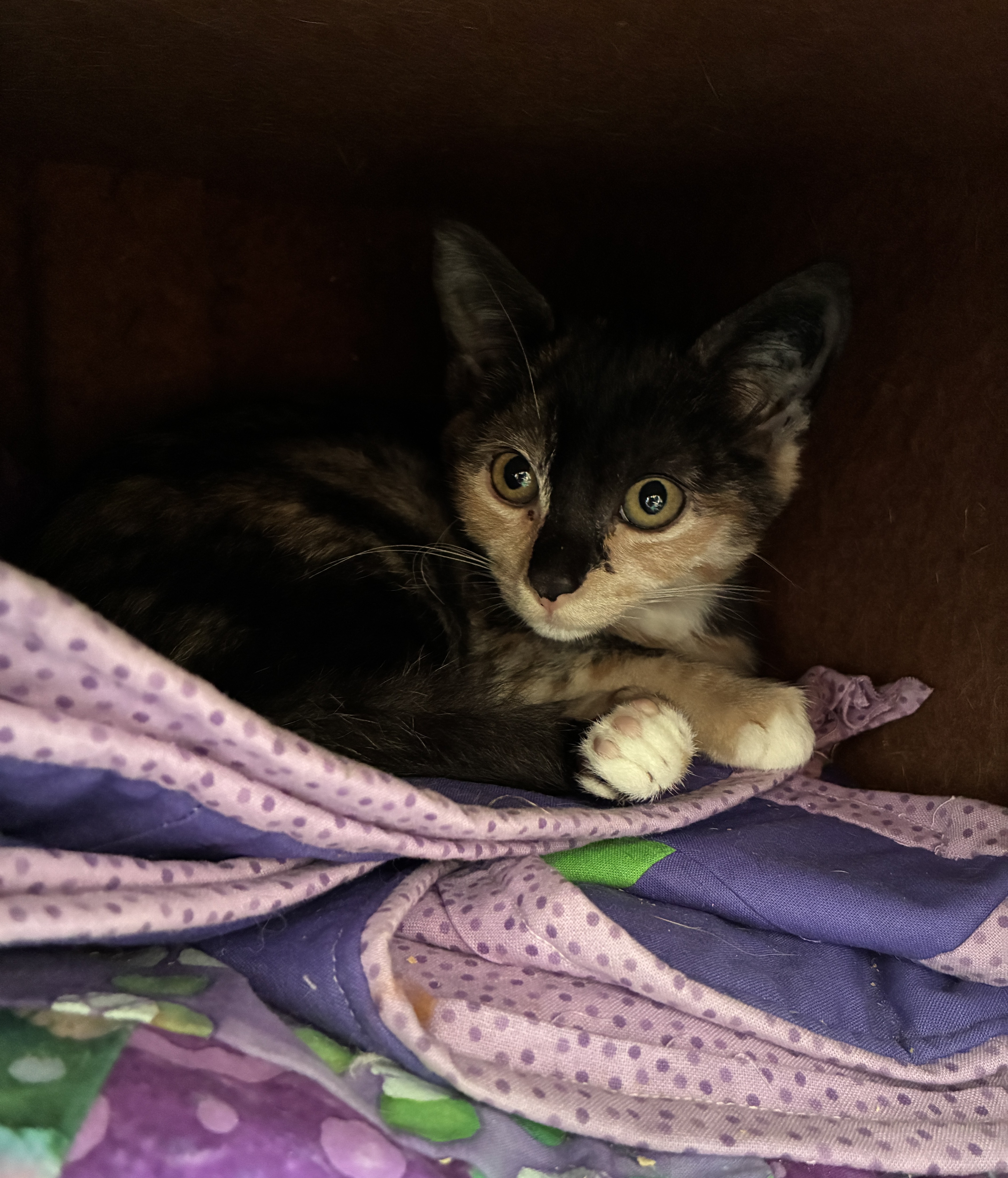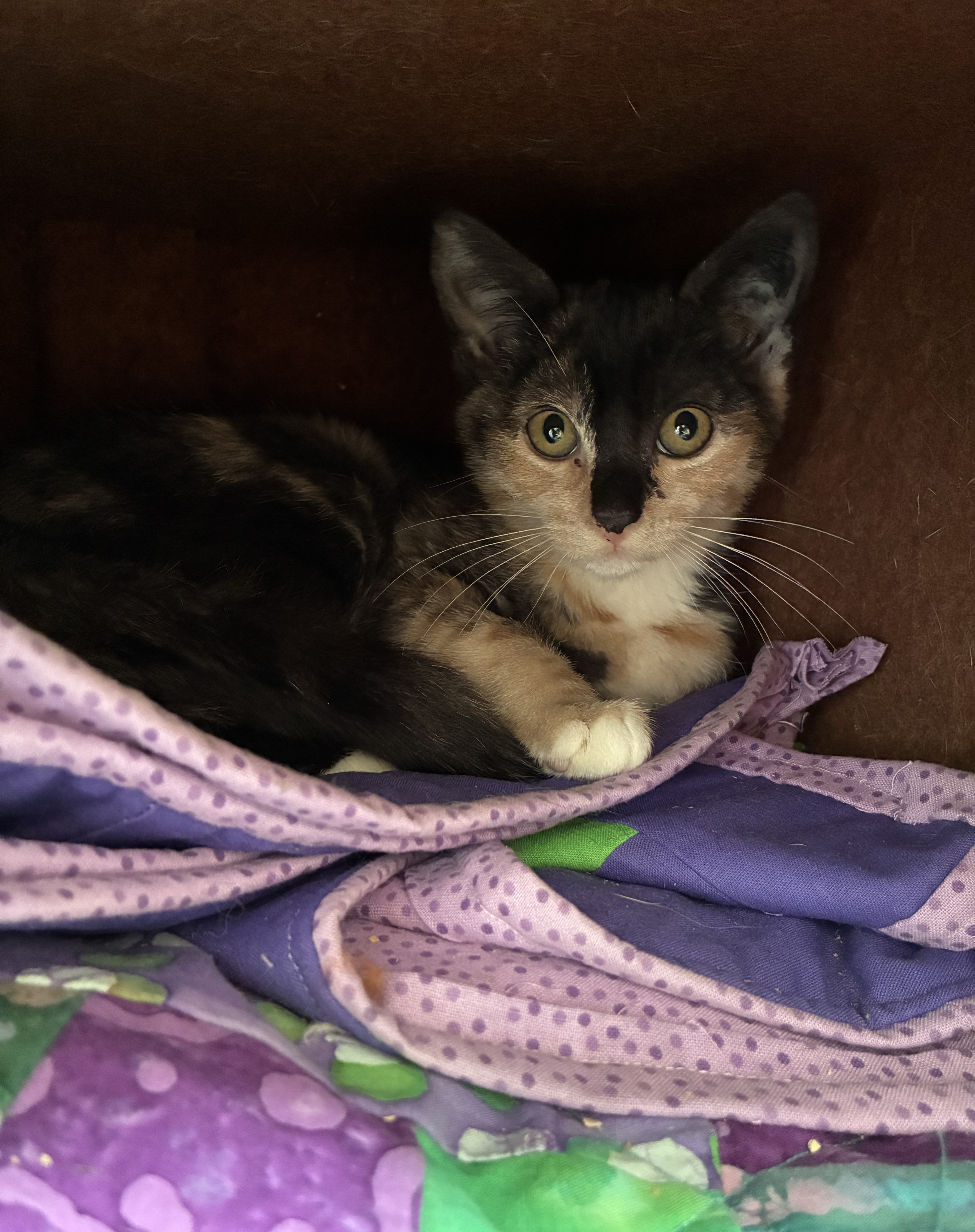 Felicity is a gentle, sensitive little kitten who’s still learning that the world can be a safe and kind place. She’s very timid and cautious by nature, and she’ll need a patient adopter who understands shy cats with a home that’s willing to move at her pace.